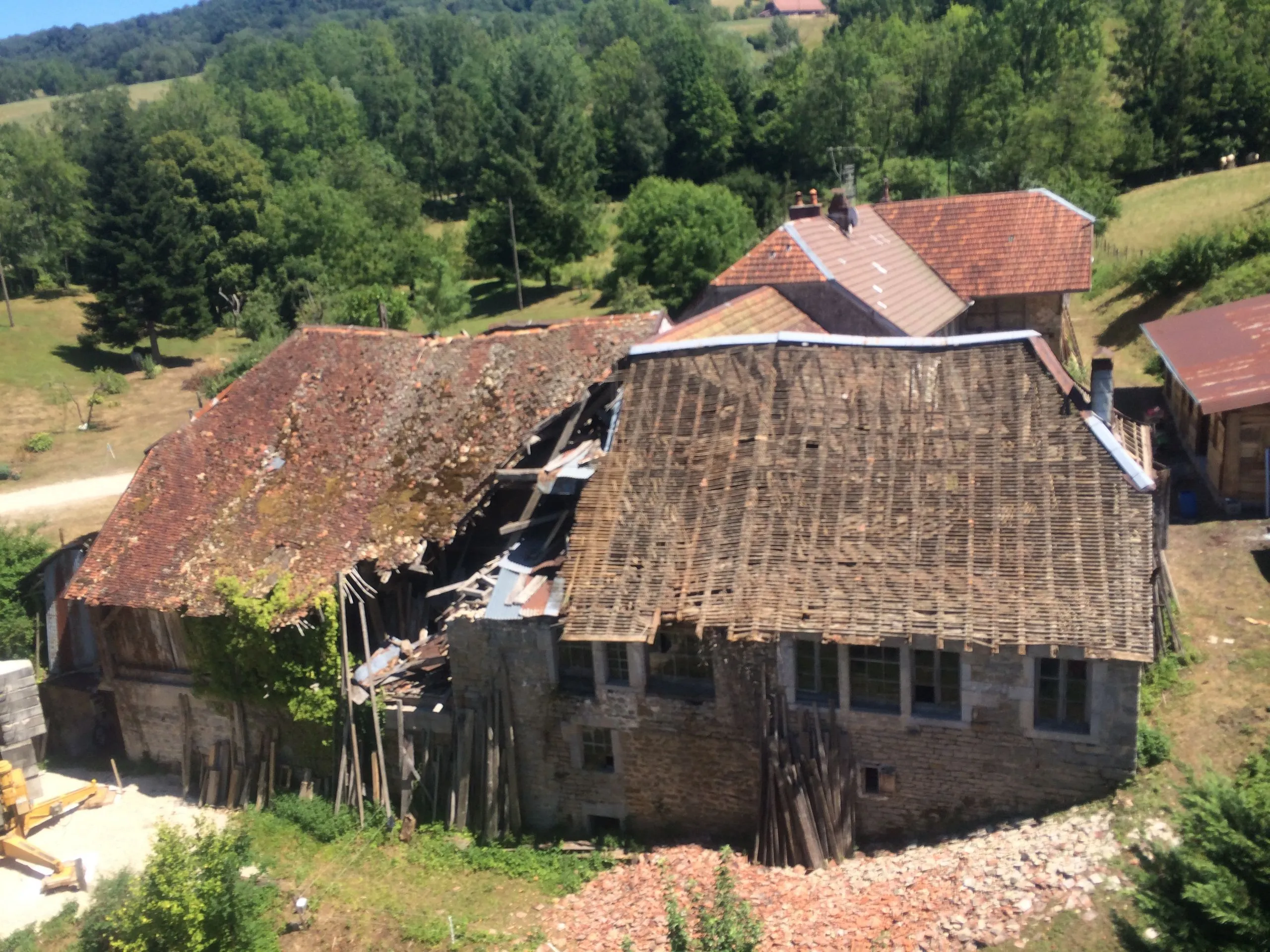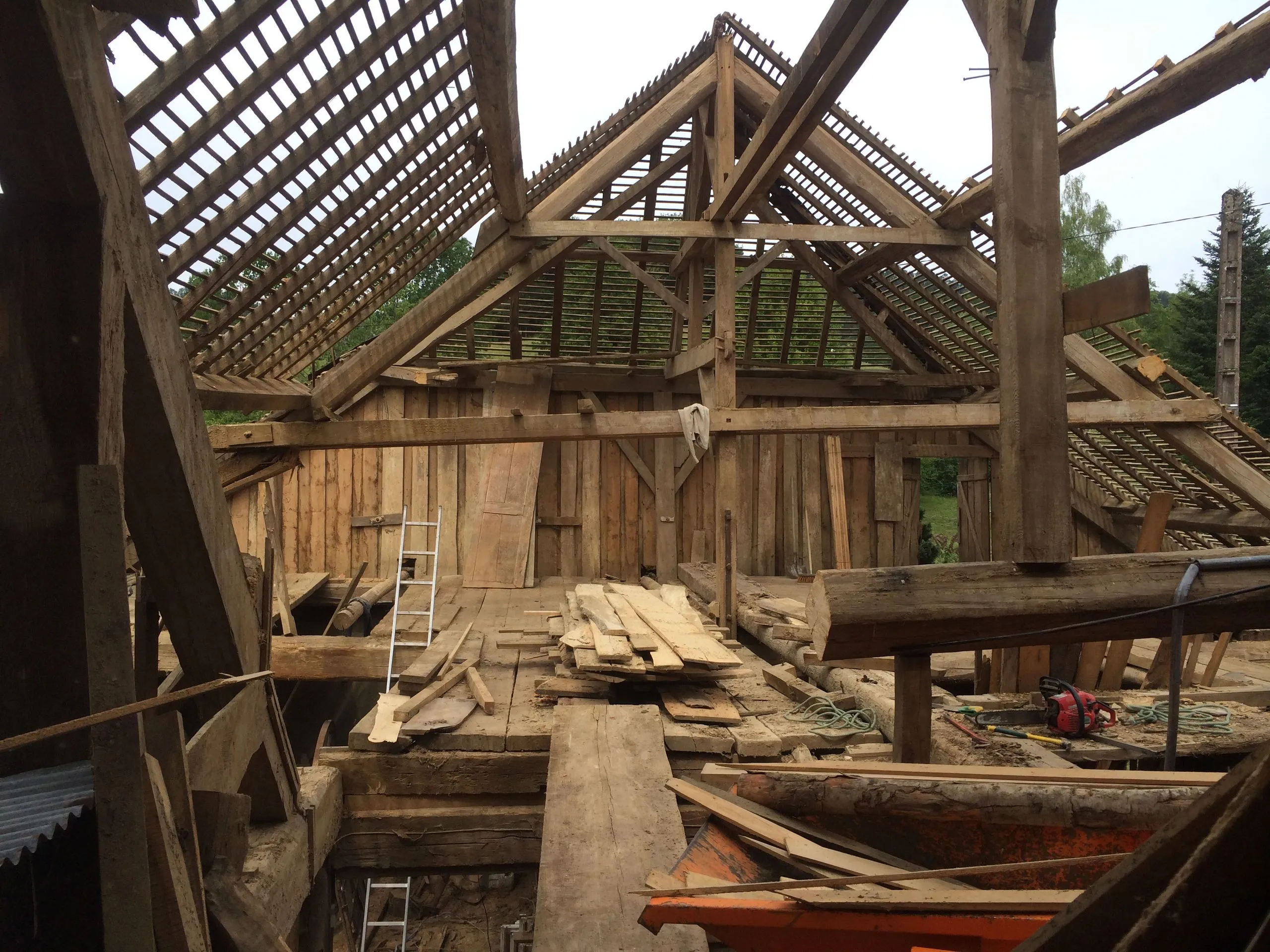 Répliquer toute la charpente à l’identique. Réhabiliter des murs entiers. Démonter entièrement le châssis. Refaire la toiture écroulée. Vider des milliers de m3 de bois encore stockés là. Et surtout, conserver la force des lieux.