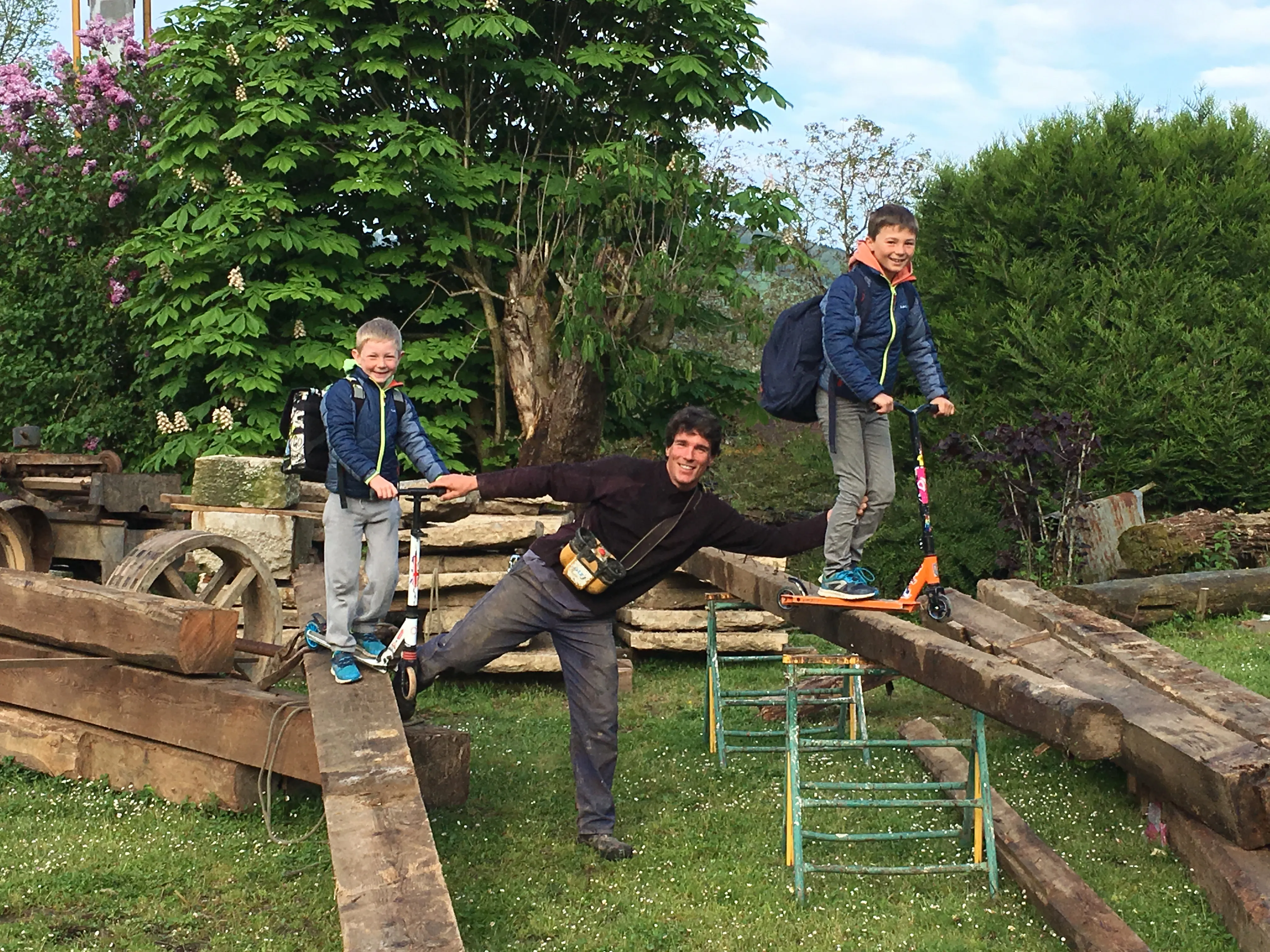 La conception, l’aménagement, la vision : Marie a porté le projet à bouts de bras. L’idée du Jura, c’était elle.. Comme tout maçon qui se respecte, Mathieu sait aussi travailler le bois. Il a réutilisé un maximum des grumes à l’abandon dans l’atelier pour créer les meubles..